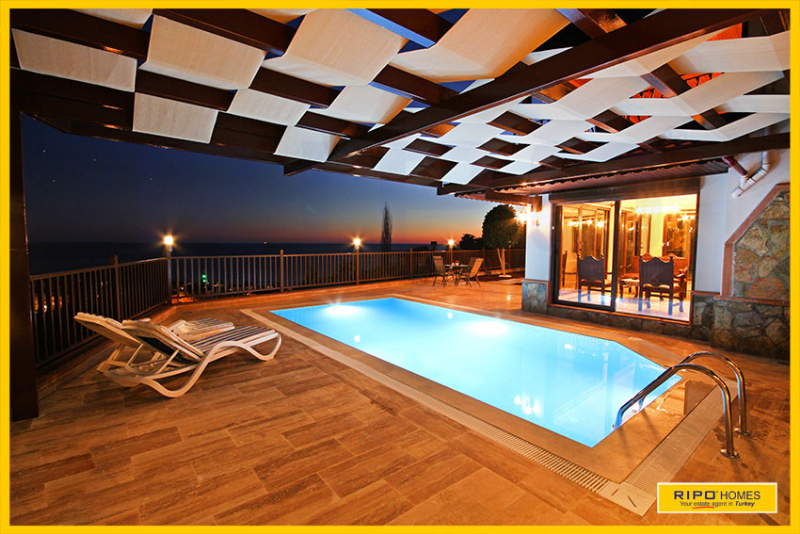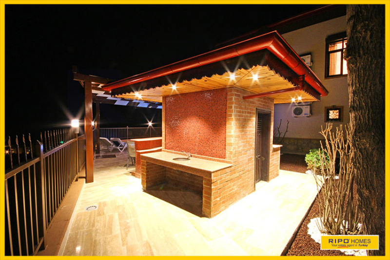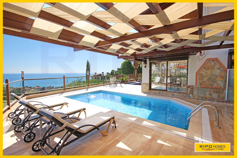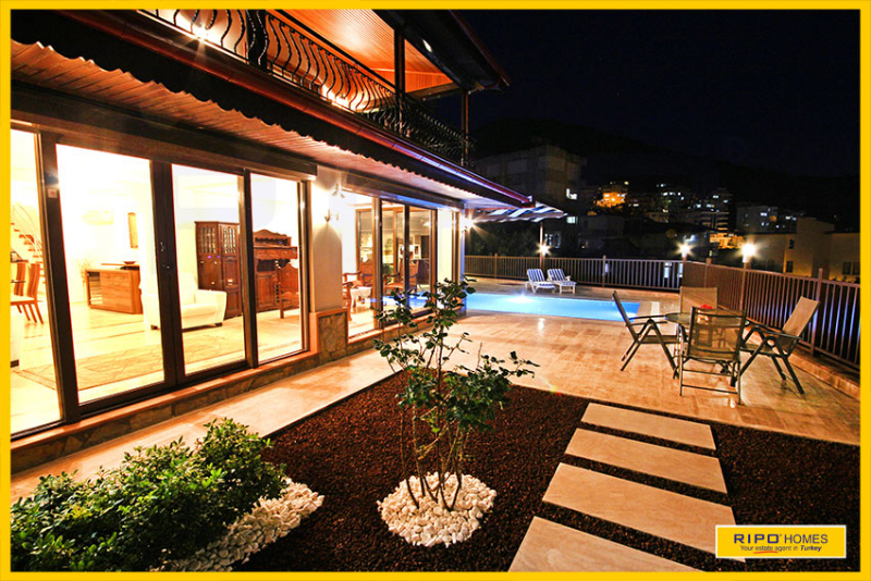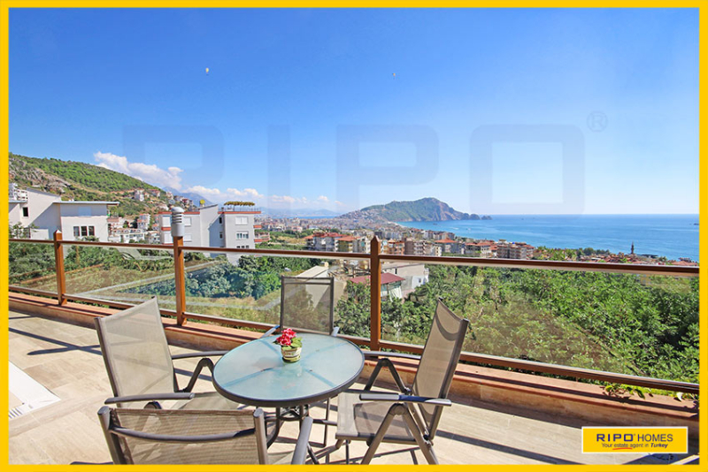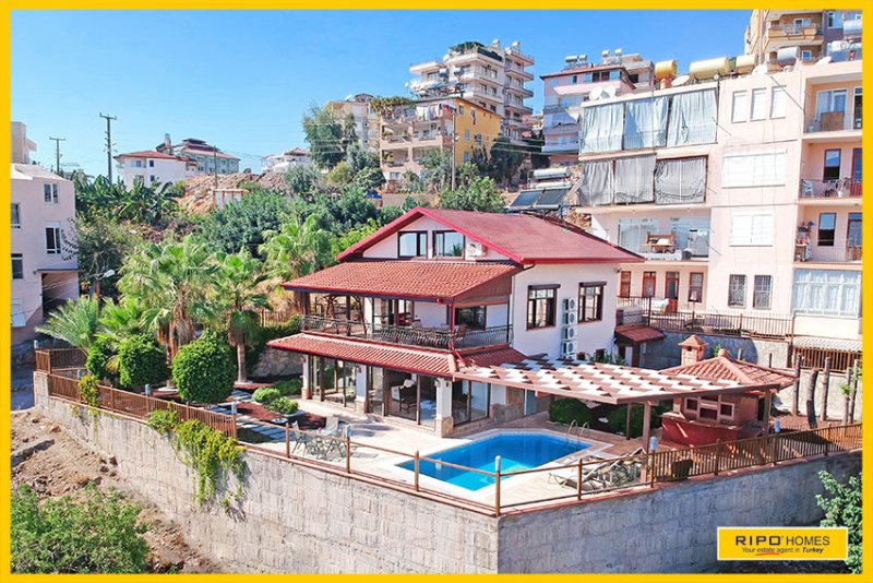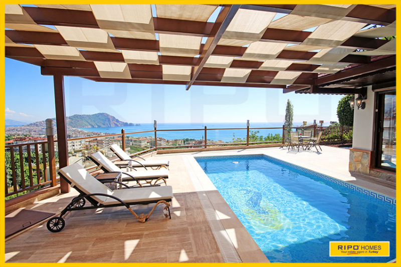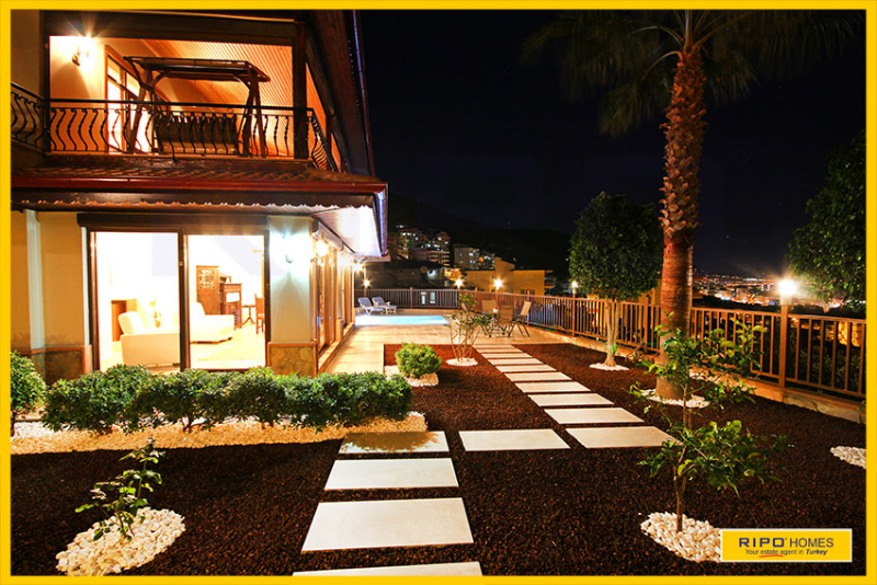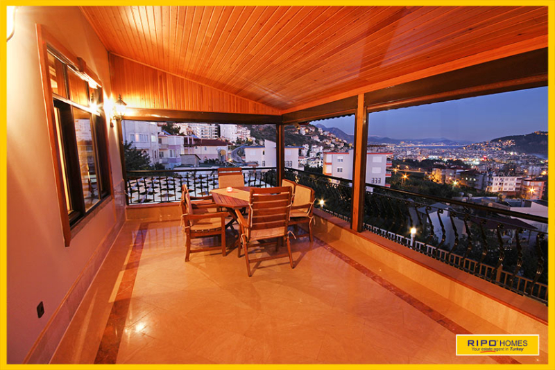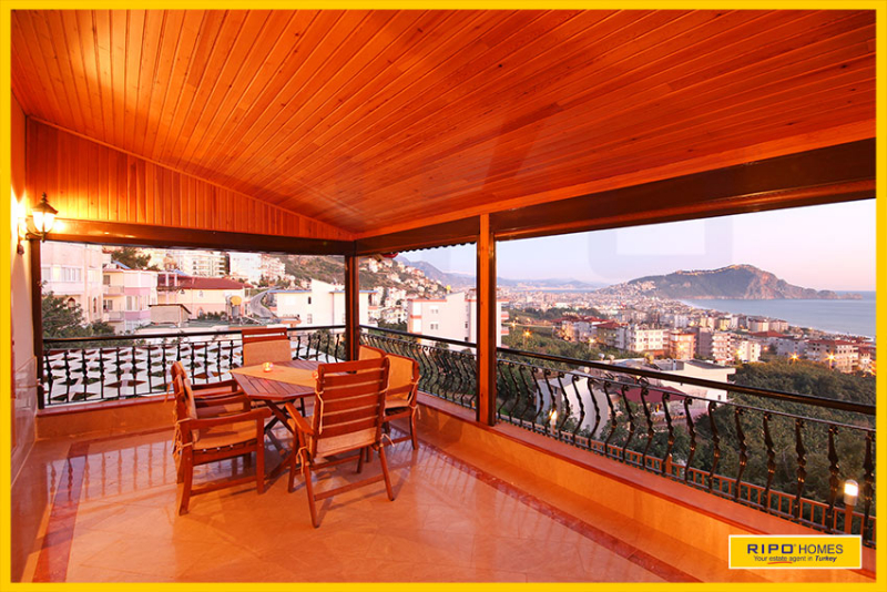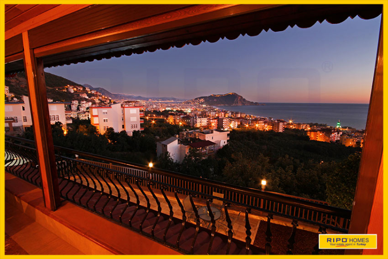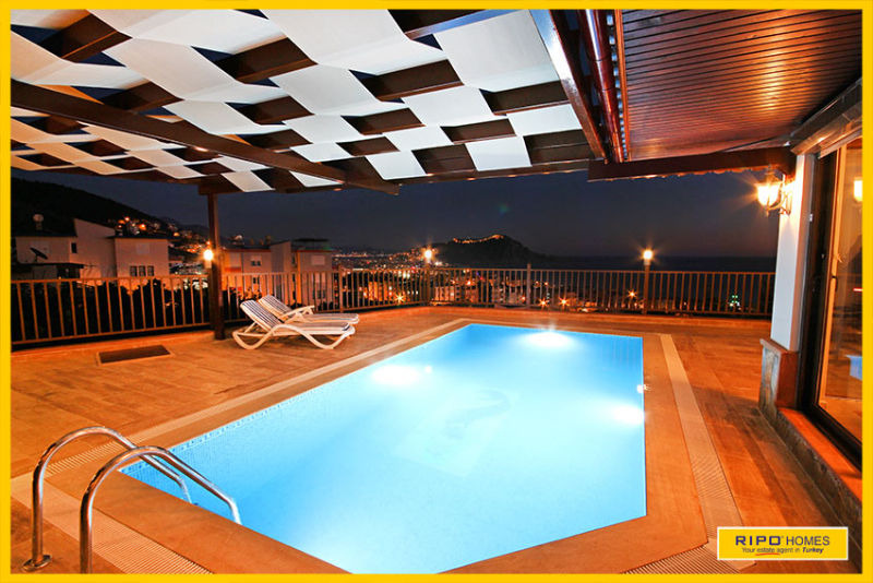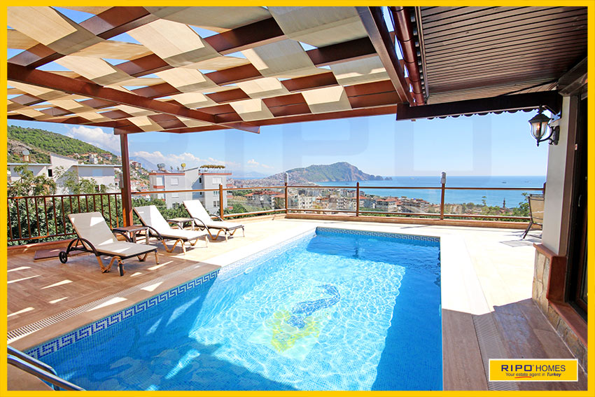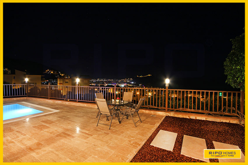 Denne moderne og stilfulde seks-værelses villa ligger på bjergsiden i Dinek, tæt på Alanya. Den har spektakulær uhindret udsigt over havet, Taurusbjergene og den imponerende borg i Alanya.