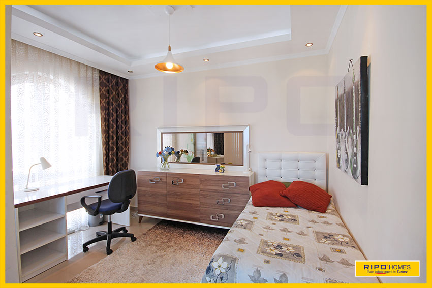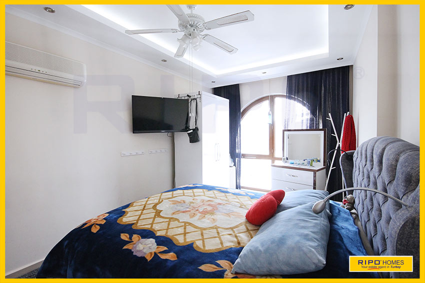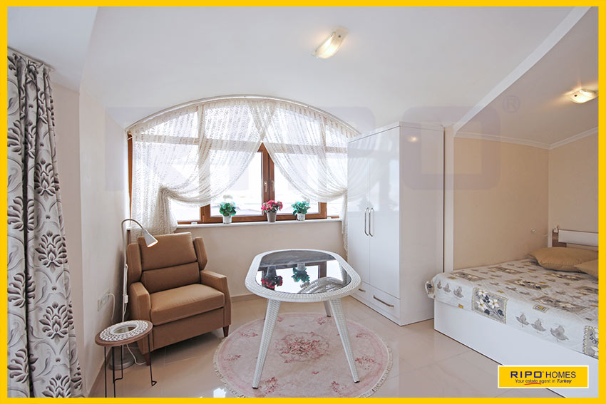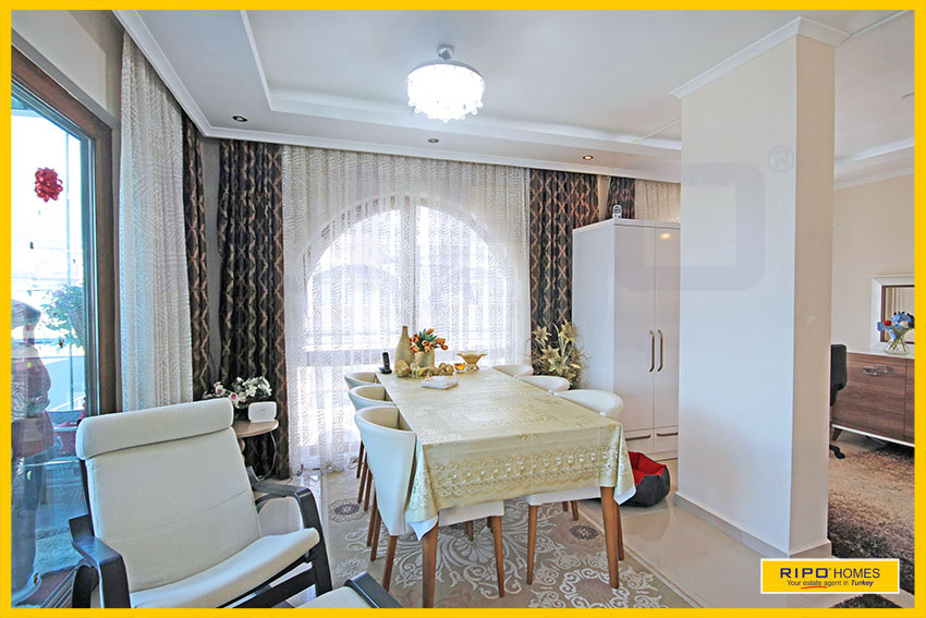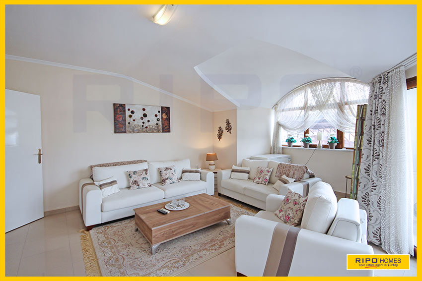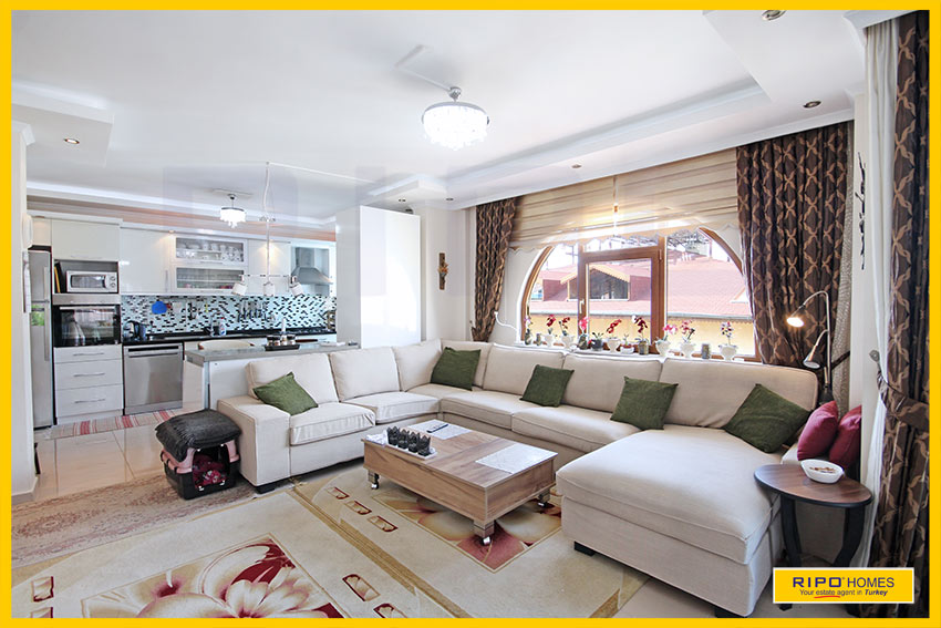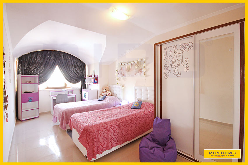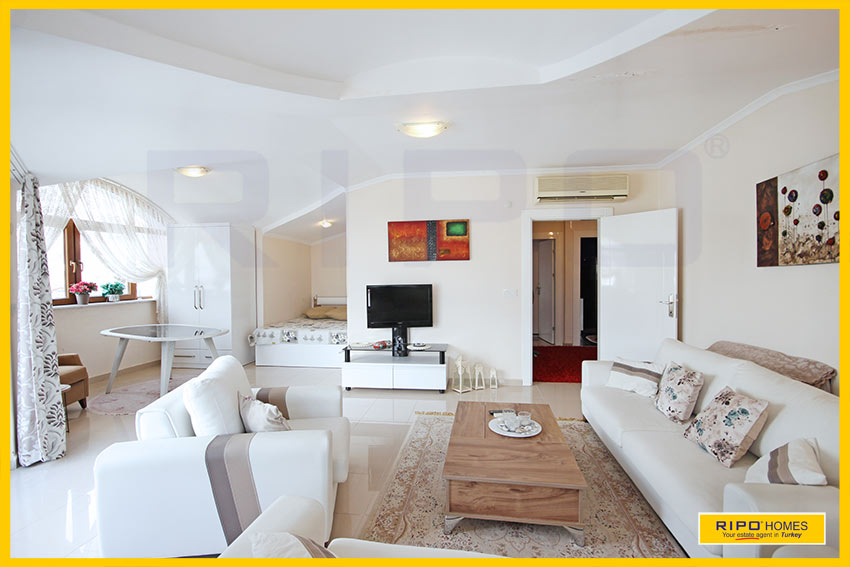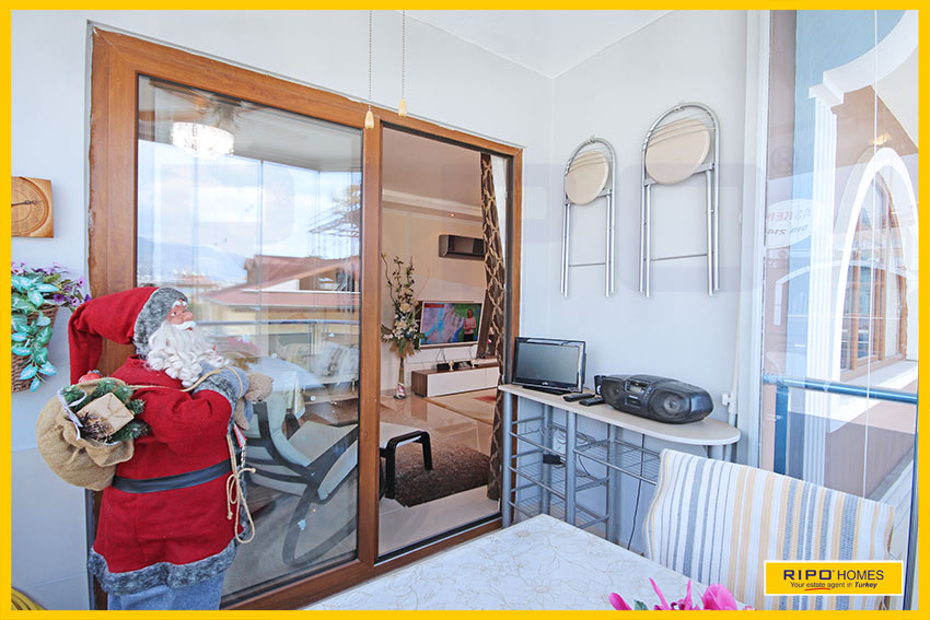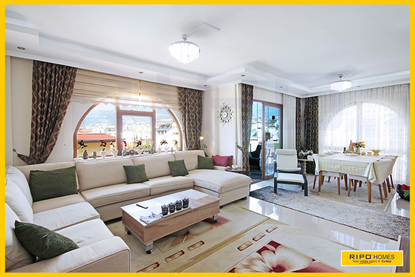 This deluxe apartment offers 215m2 of heaven with scope for changing the room usage. Tastefully furnished and decorated, the focal point is a welcoming living and dining area surrounded by arched feature windows and doors. To the rear is a stylish kitchen, separated by a handy breakfast bar with its own small balcony. Outside is a large, fully enclosed balcony with superb views of the Taurus mountains. Open to this central space is also a small bedroom, which could double as a reading room or office. There is also a spacious entrance hall providing access to a large double bedroom with an ensuite and a family bathroom on this level.