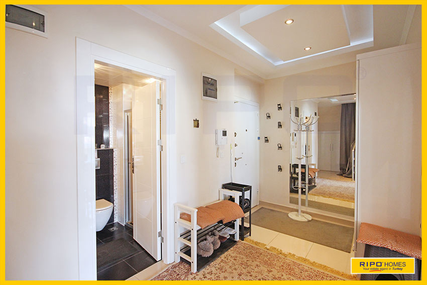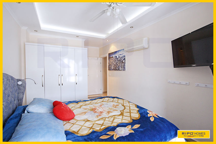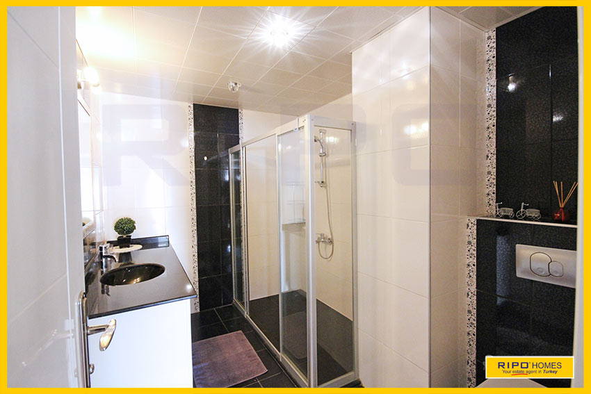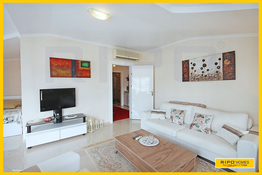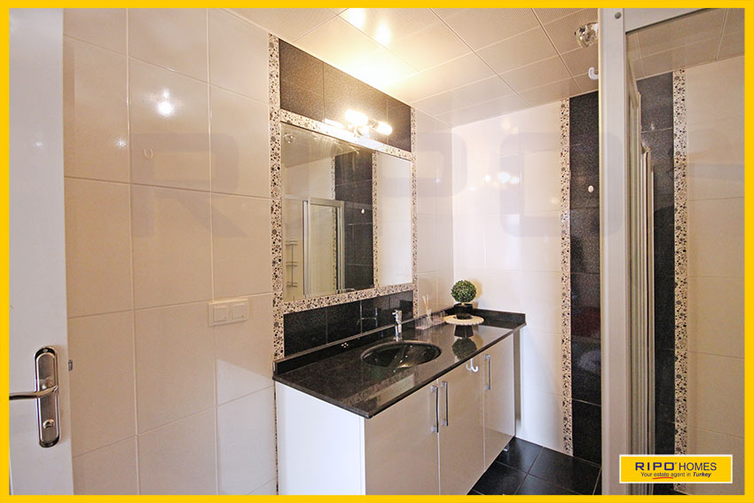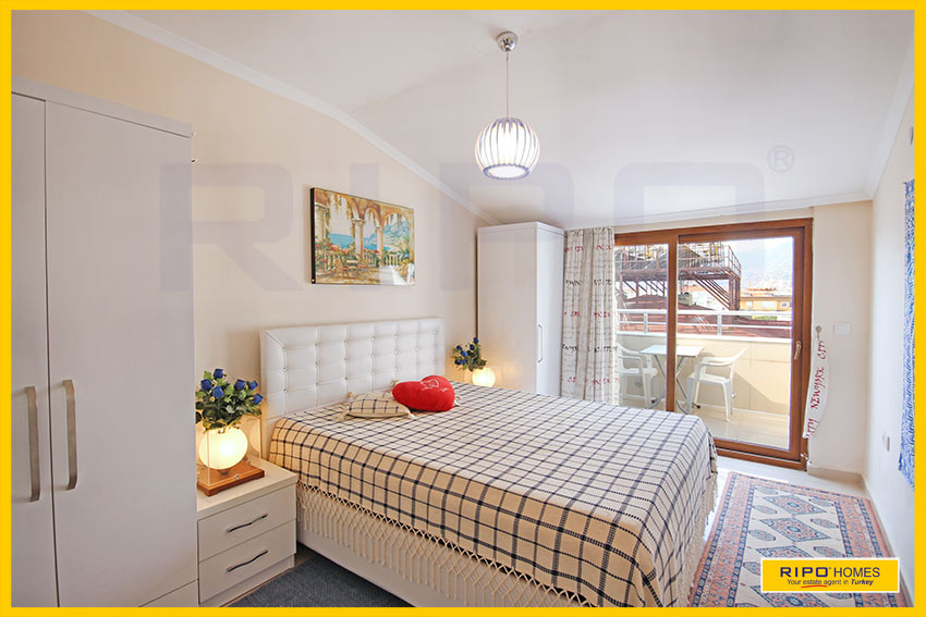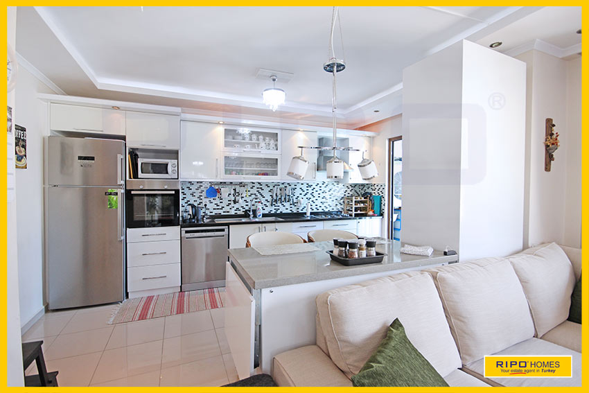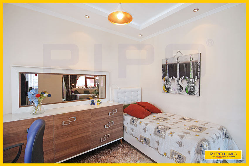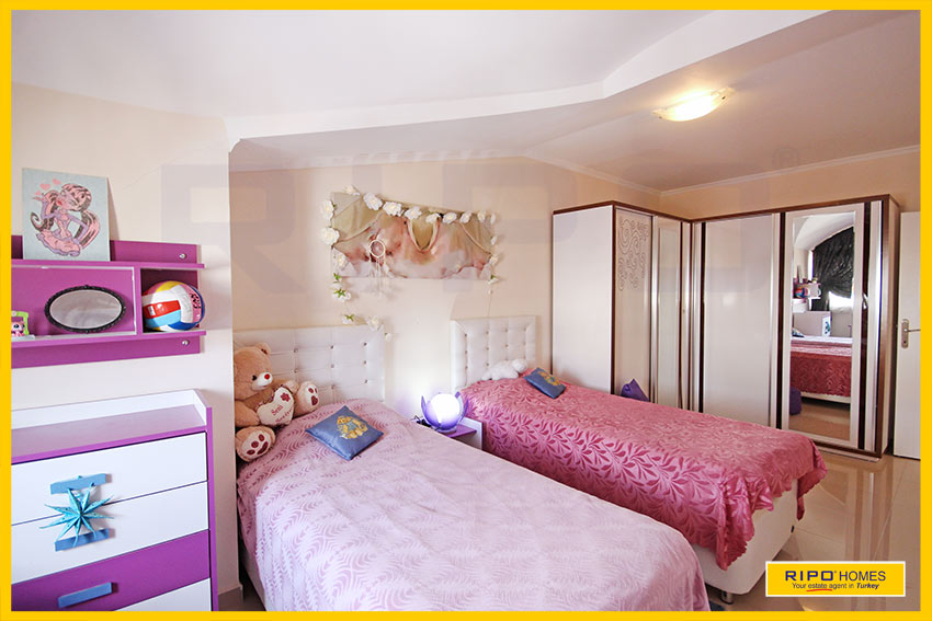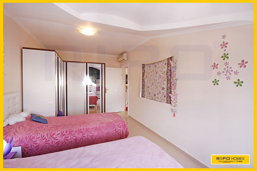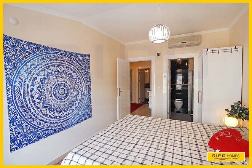 This deluxe apartment offers 215m2 of heaven with scope for changing the room usage. Tastefully furnished and decorated, the focal point is a welcoming living and dining area surrounded by arched feature windows and doors. To the rear is a stylish kitchen, separated by a handy breakfast bar with its own small balcony. Outside is a large, fully enclosed balcony with superb views of the Taurus mountains. Open to this central space is also a small bedroom, which could double as a reading room or office. There is also a spacious entrance hall providing access to a large double bedroom with an ensuite and a family bathroom on this level.
