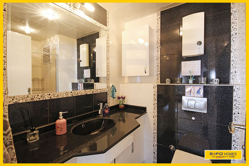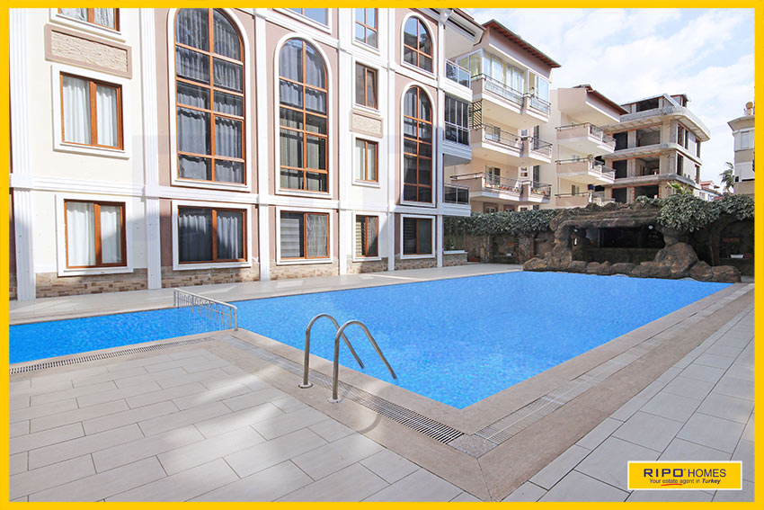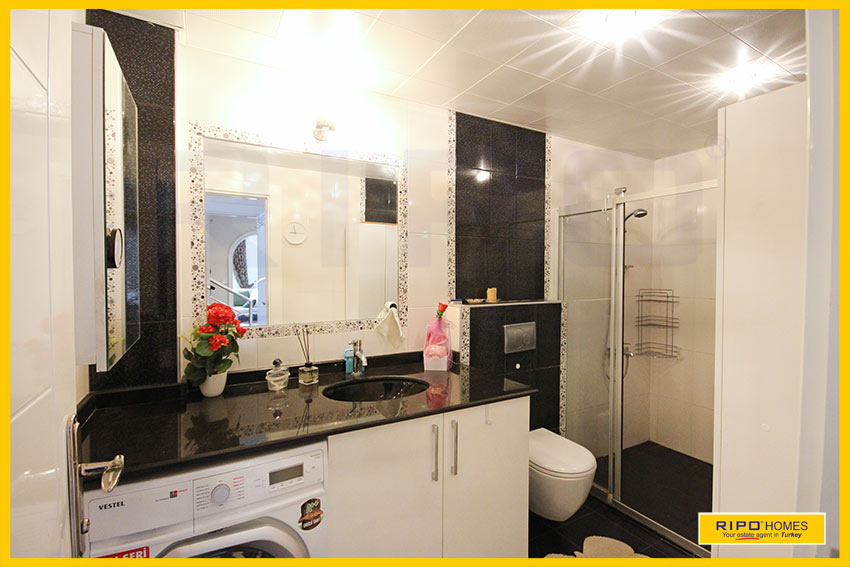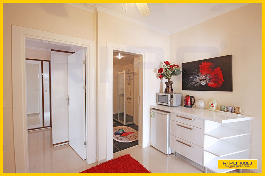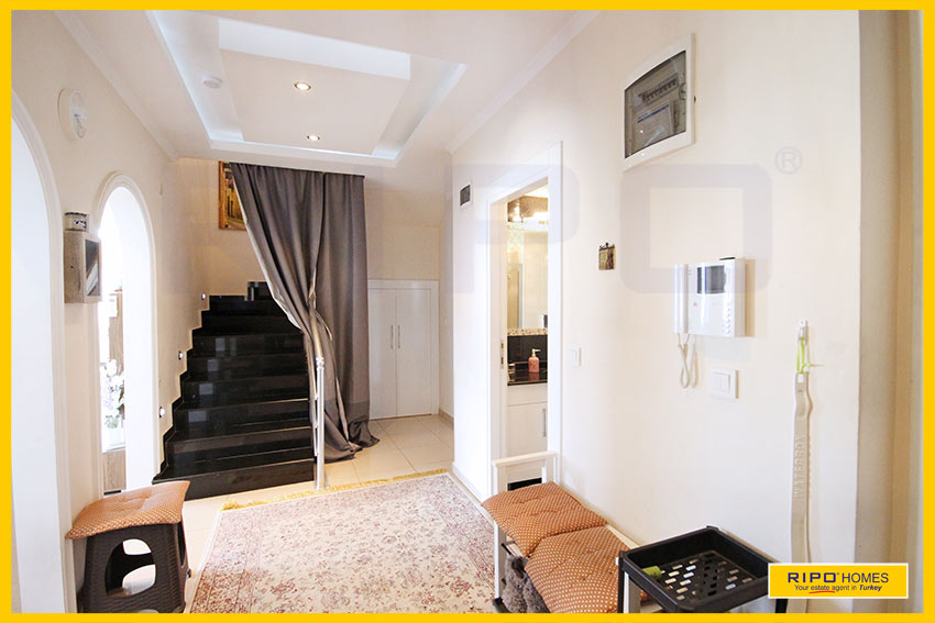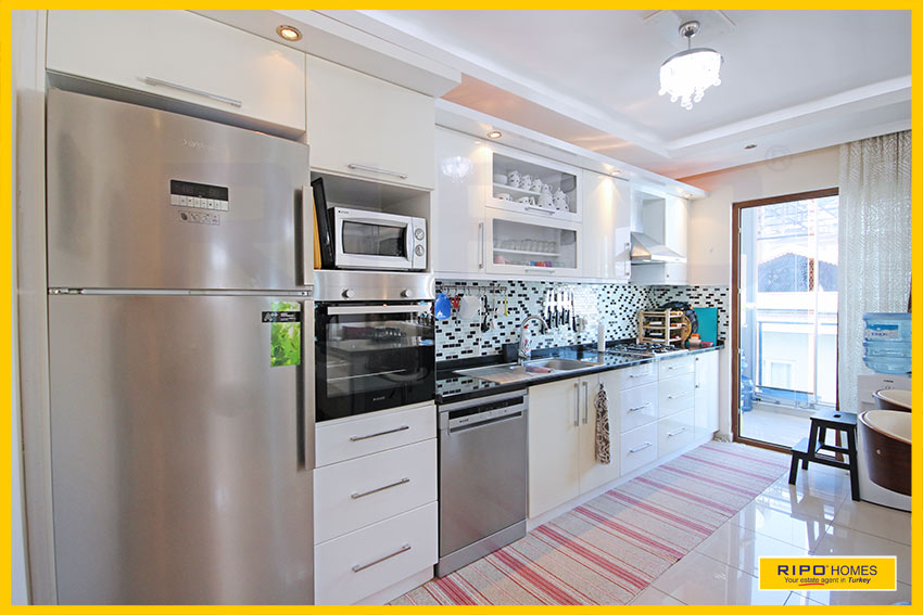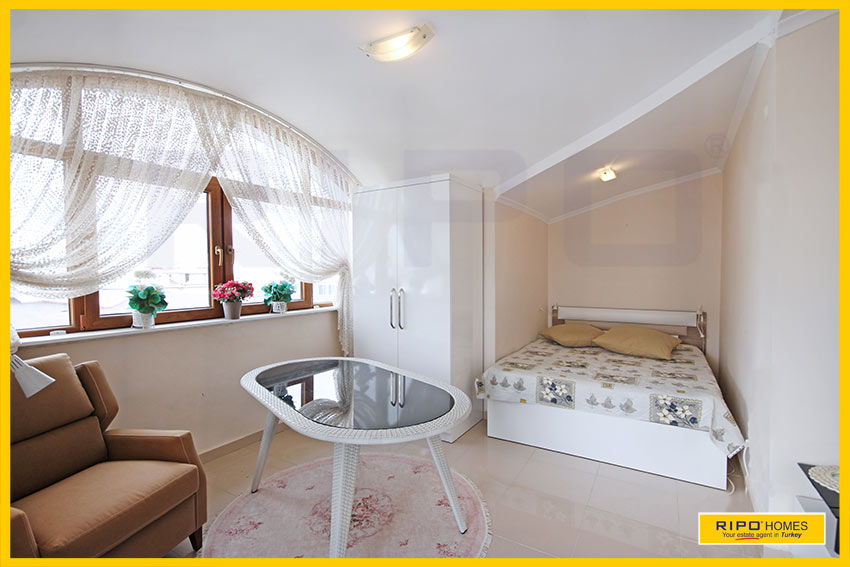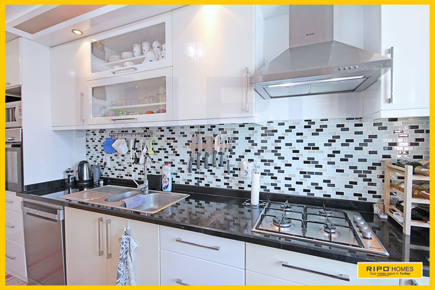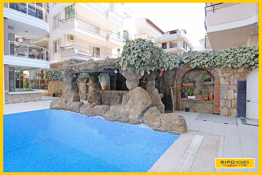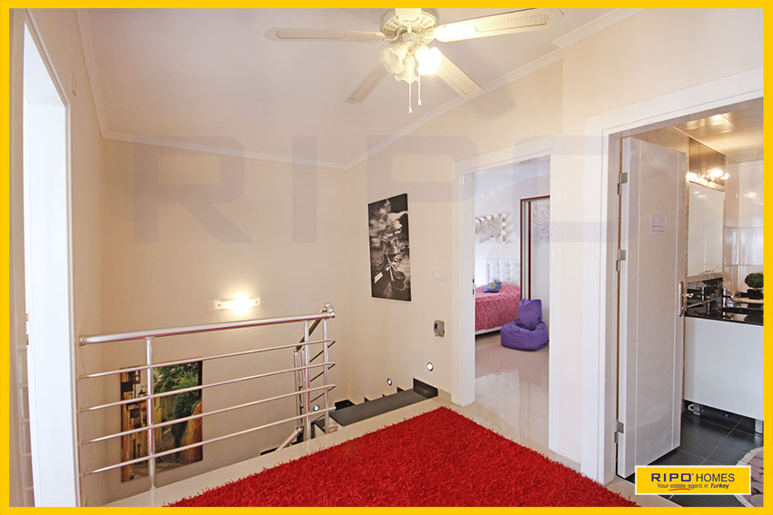 This deluxe apartment offers 215m2 of heaven with scope for changing the room usage. Tastefully furnished and decorated, the focal point is a welcoming living and dining area surrounded by arched feature windows and doors. To the rear is a stylish kitchen, separated by a handy breakfast bar with its own small balcony. Outside is a large, fully enclosed balcony with superb views of the Taurus mountains. Open to this central space is also a small bedroom, which could double as a reading room or office. There is also a spacious entrance hall providing access to a large double bedroom with an ensuite and a family bathroom on this level.